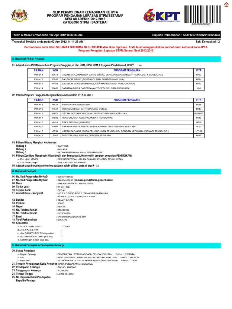 Slip Permohonan Kemasukan Ke Ipta Program Pengajian Lepasan Stpm Setaraf Sesi Akademik 2012 2013 Kategori Stpm Sastera
