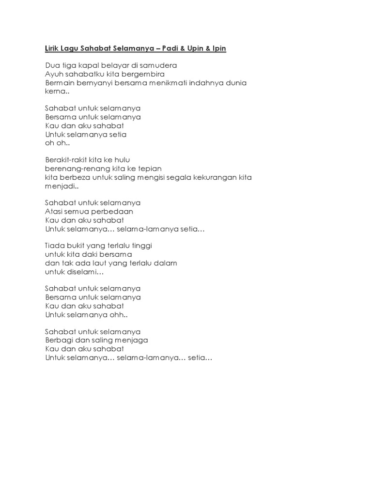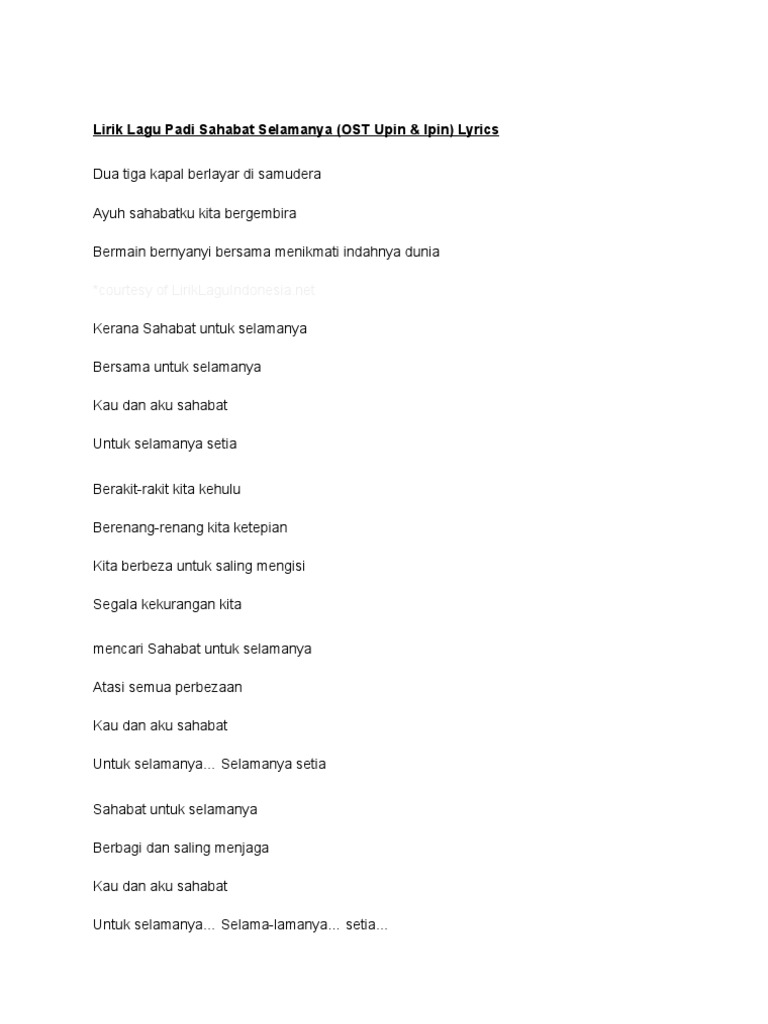 Lirik Lagu Sahabat Selamanya Padi Upin Ipin